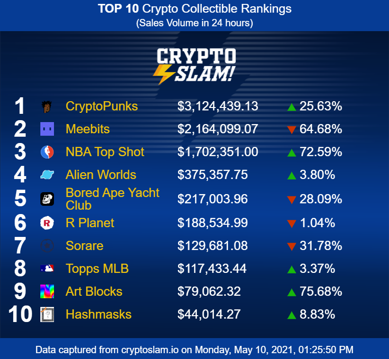 Cryptoslam On Twitter A New Nft Project In The Top 5 Nbatopshot Epic Drop Today Larvalabs Cryptopunks Christiesinc May Auction Approaching Topps Mlb Week Two Burn And